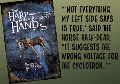 A work in search of a publisher, this dark fantasy sends a half dead unicorn and a twist-fingered harpist on a desperate quest through a land of bric-a-brac. Old enemies don't reconcile, past crimes aren't forgiven, and the half-dead horse must become all the way dead again.